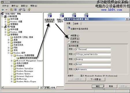 第二步:右擊“位置欄中顯示的項(xiàng)目”選擇“屬性”,打開(如圖3)所示的對話框,選中其中的“已啟用”項(xiàng),則對話框“顯示的位置”下的“項(xiàng)目1”、“項(xiàng)目2”等五個(gè)輸入框被激活,按照以下原則修改位置欄中的項(xiàng)目。