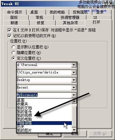 先安裝TweakUI工具,再選擇“開始→設(shè)置→控制面板”,雙擊“用戶接口自定義”圖標(biāo),單擊“打開”標(biāo)簽,選中“位置列”下的“自定義位置列”復(fù)選框。再在下面的文本框中選擇常用文件夾(也可以輸入自定義文件夾),(如圖4)所示。以后,就會在“打開”和“保存”對話框的左側(cè)窗格出現(xiàn)相應(yīng)文件夾按鈕,單擊后即可進(jìn)入,非常方便。